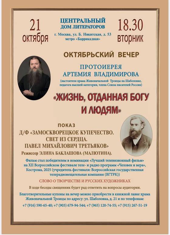 - Показ документального фильма «Замосворецкое купечество. Свет из сердца. Павел Михайлович Третьяков»